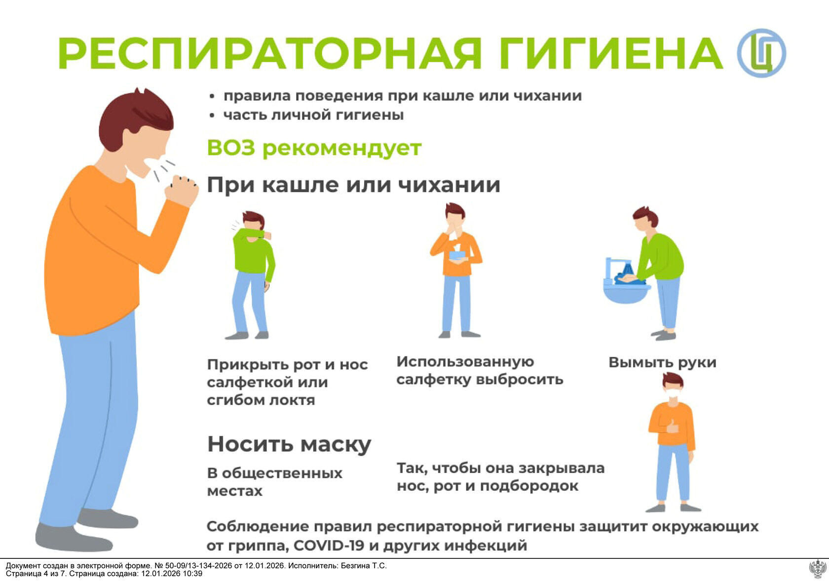 - Прикрывайте нос и рот одноразовой салфеткой при кашле или чихании, затем выбрасывайте салфетку и мойте руки.